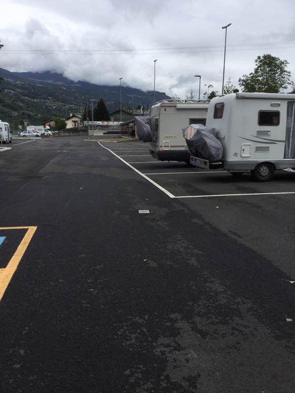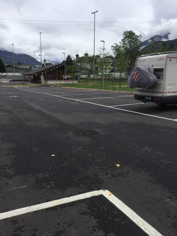Area adiacente il centro sportivo e bocciodromo, a pagamento, su asfalto, pianeggiante, video sorvegliata, con 13 stalli di grandi dimensioni, colonnine elettriche e camper service.