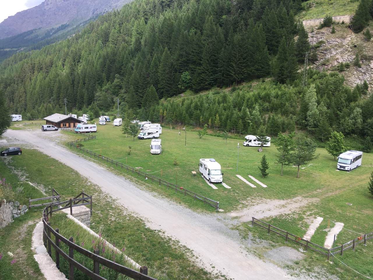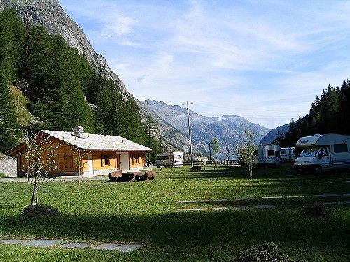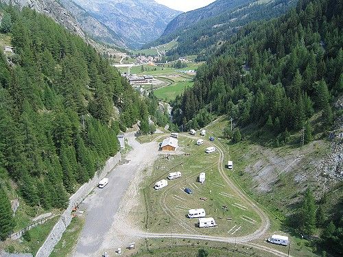 In Valgrisanche, alla fine dell'abitato, area sosta sotto la diga di Beauregarde, a pagamento, 60 posti su prato, in piano, con collegamento elettrico.