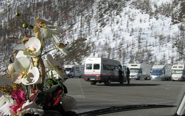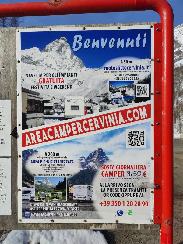 Forse a Cervinia spetta veramente il primato per la peggiore accoglienza dei camper! Un'area di sosta indecente, in un piazzale dove l'asfalto è del tutto sgretolato e che probabilmente ha visto il ghiaccio di almeno qualche lustro e non è stato mai riparato. Una fontanella per l'acqua senza attacco per potersi rifornire, usata contemporaneamente sia per l'acqua potabile sia per la pulizia degli scarichi. Per la registrazione e il pagamento on line manca solo la richiesta del numero delle scarpe o della misura del reggiseno di tua moglie! Mi sapete dire a cosa vi servono i dati di un documento se vi devo mandare la fotografia fronte/retro del documento stesso?Domani scappo via! La sosta e la circolazione in centro sono interdetti ai camper, non si arriva neanche agli impianti di risalita. Un'ottimo servizi per gli alberghi e i residence dei VIP, ma non per noi!