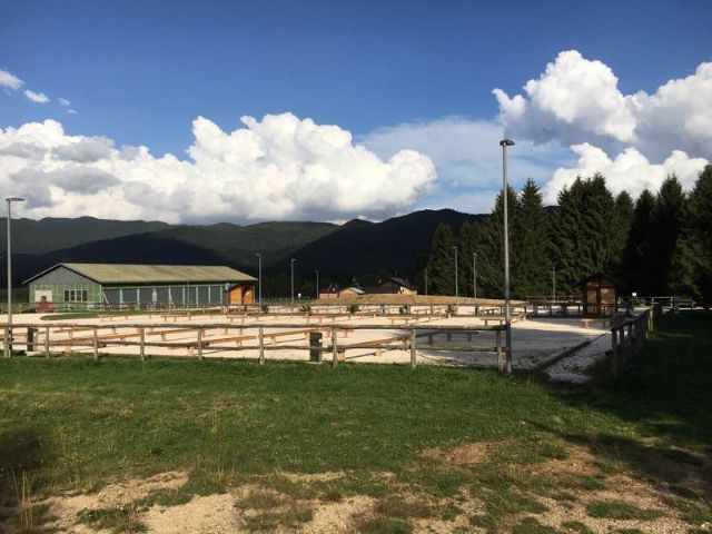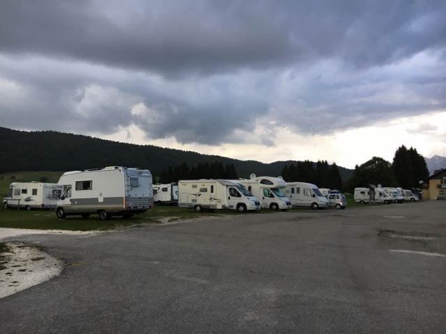 Dietro il rifugio Santo Osvaldo, area camper a pagamento (bancomat o carta di credito) con sbarre accesso 30 ampi posti delimitati da staccionate, zona carico e scarico, allacciamento elettrico.