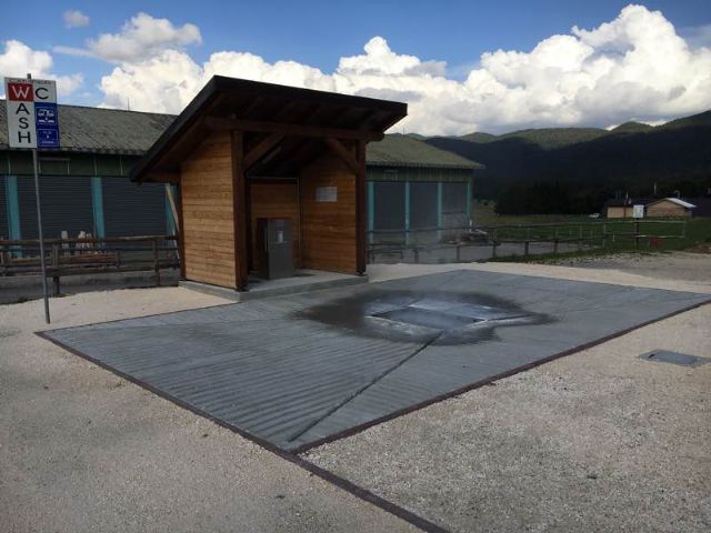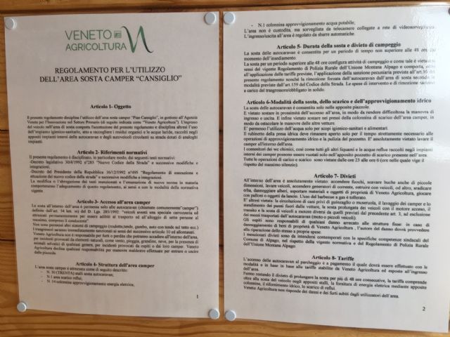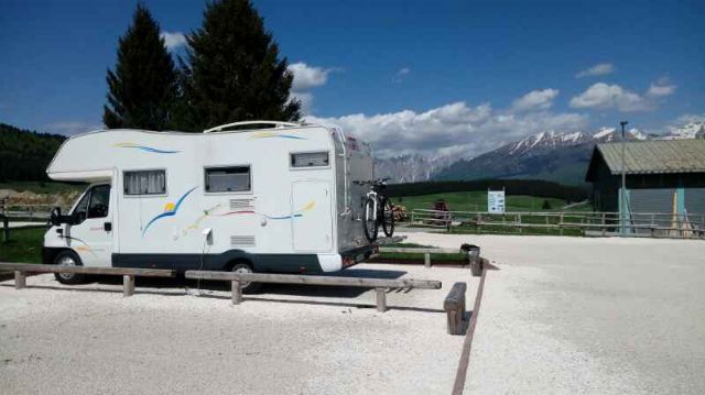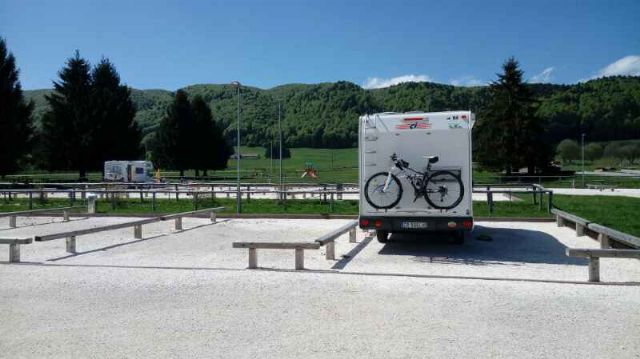 Direi che quest’area ha tutte le migliori caratteristiche che si possono desiderare per un’area di sosta camper/caravan. In piano, spazi delimitati con staccionata, ad evitare che qualcuno si infili dove non dovrebbe o che altri occupino troppo spazio, su stabilizzato, facilmente accessibile, con allaccio elettrico compreso nel prezzo della sosta, a basso prezzo (6 euro ogni 12 ore). Manca l’ombra, ma siamo oltre i 1000 metri, quindi va bene anche il sole. Volendo c’è spazio per aprire il tendalino. Un camper service perfetto sia come funzionalità che come accessibilità. Insomma, complimenti ai progettisti e a chi la gestisce.