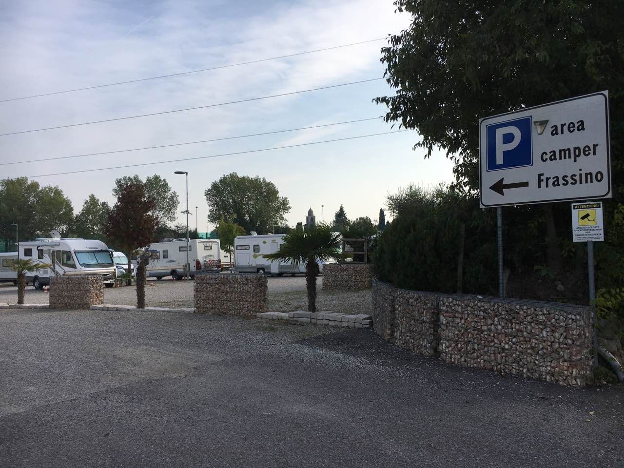 Ottima area di sosta attrezzata con efficienti servizi quali bagni, docce, carico scarico, distributore bevande caffè, con vicino una buona pizzeria ristorante anche da asporto, il bar dell'hotel per aperitivi e colazione, due grandi supermercati, il Santuario Madonna del Frassino, un fornito ferramenta ed il centro abbastanza facile da raggiungere. Videosorvegliata e ben illuminata. Adatta anche a camper grandi eventualmente con rimorchio previa autorizzazione alla direzione. Consigliata.