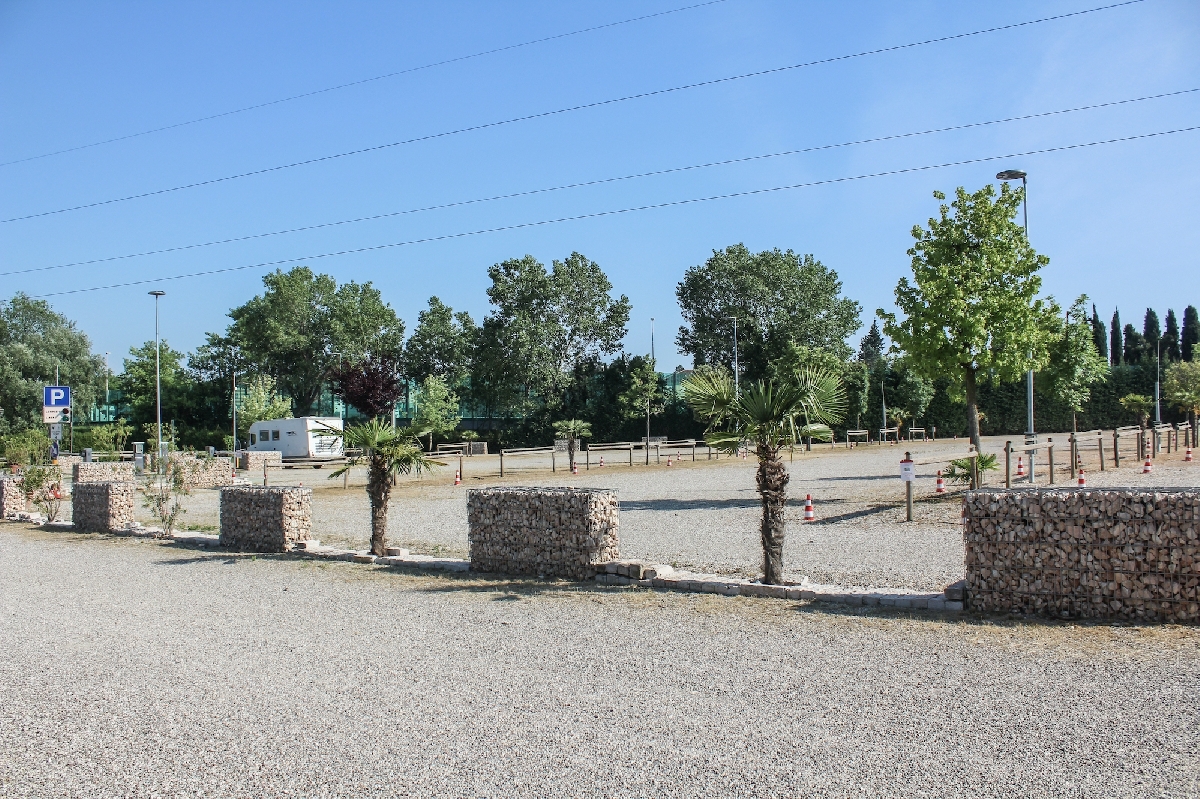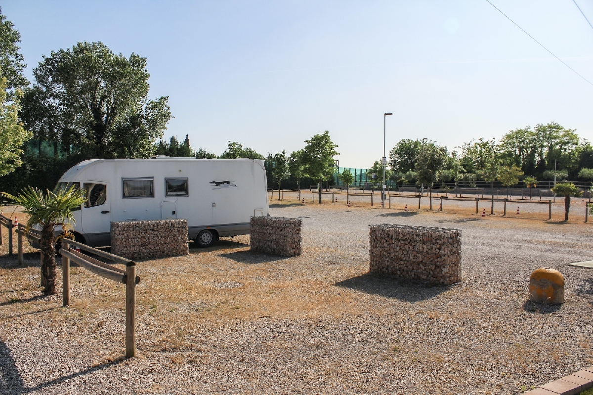 A 1,5 km dal centro e dal Lago di Garda, area camper con accesso e pagamento automatizzato, recintata e video sorvegliata, non ombreggiata, dispone di circa 90 stalli con allacciamento elettrico, alcuni leggermente in pendenza su fondo ghiaioso. Servizi igienici, docce calde divise per genere e per i diversamente abili, lavelli e lavatoi, Wi-Fi, carico-scarico e zona bar in area relax.