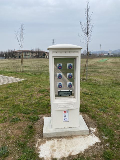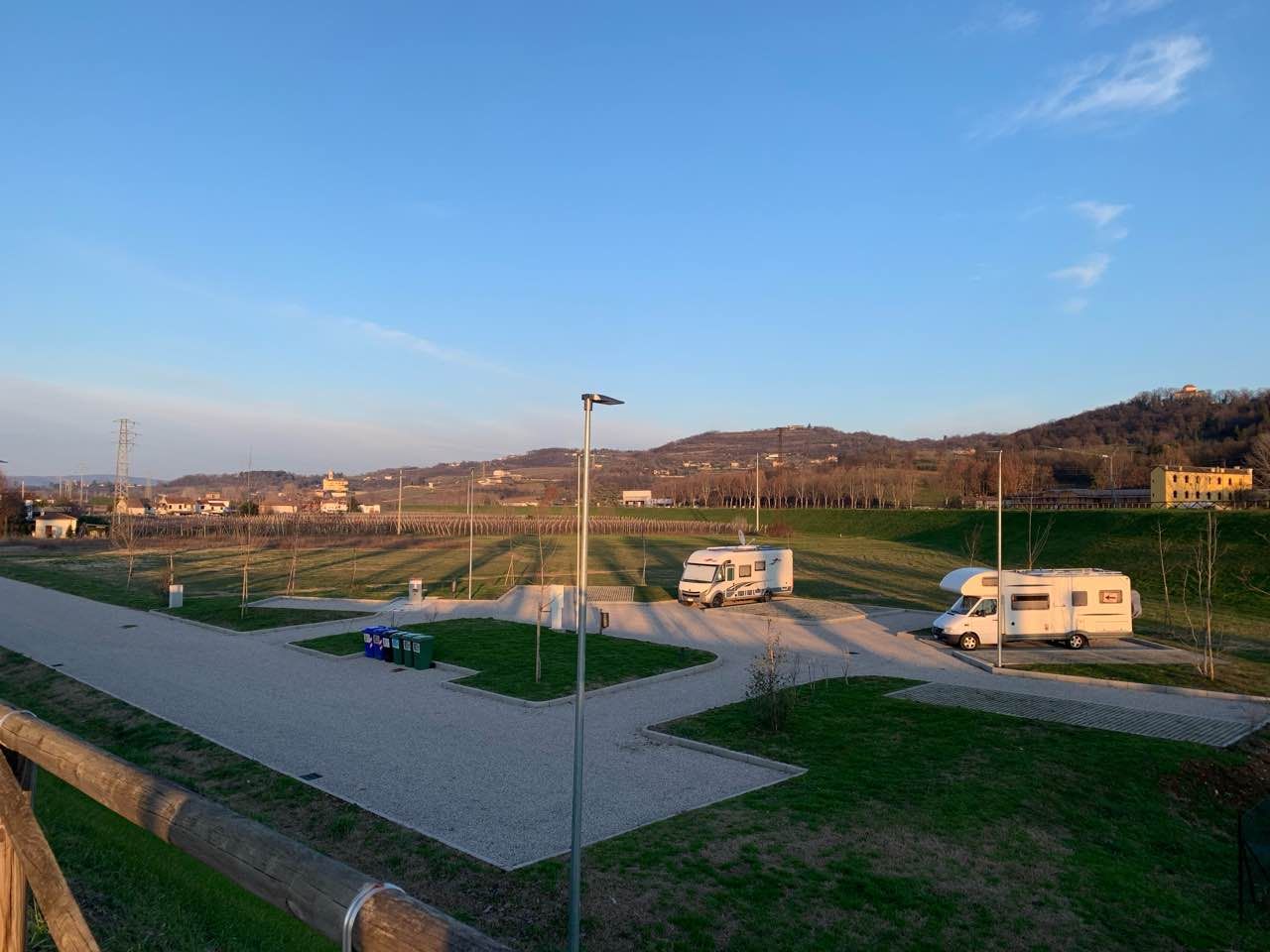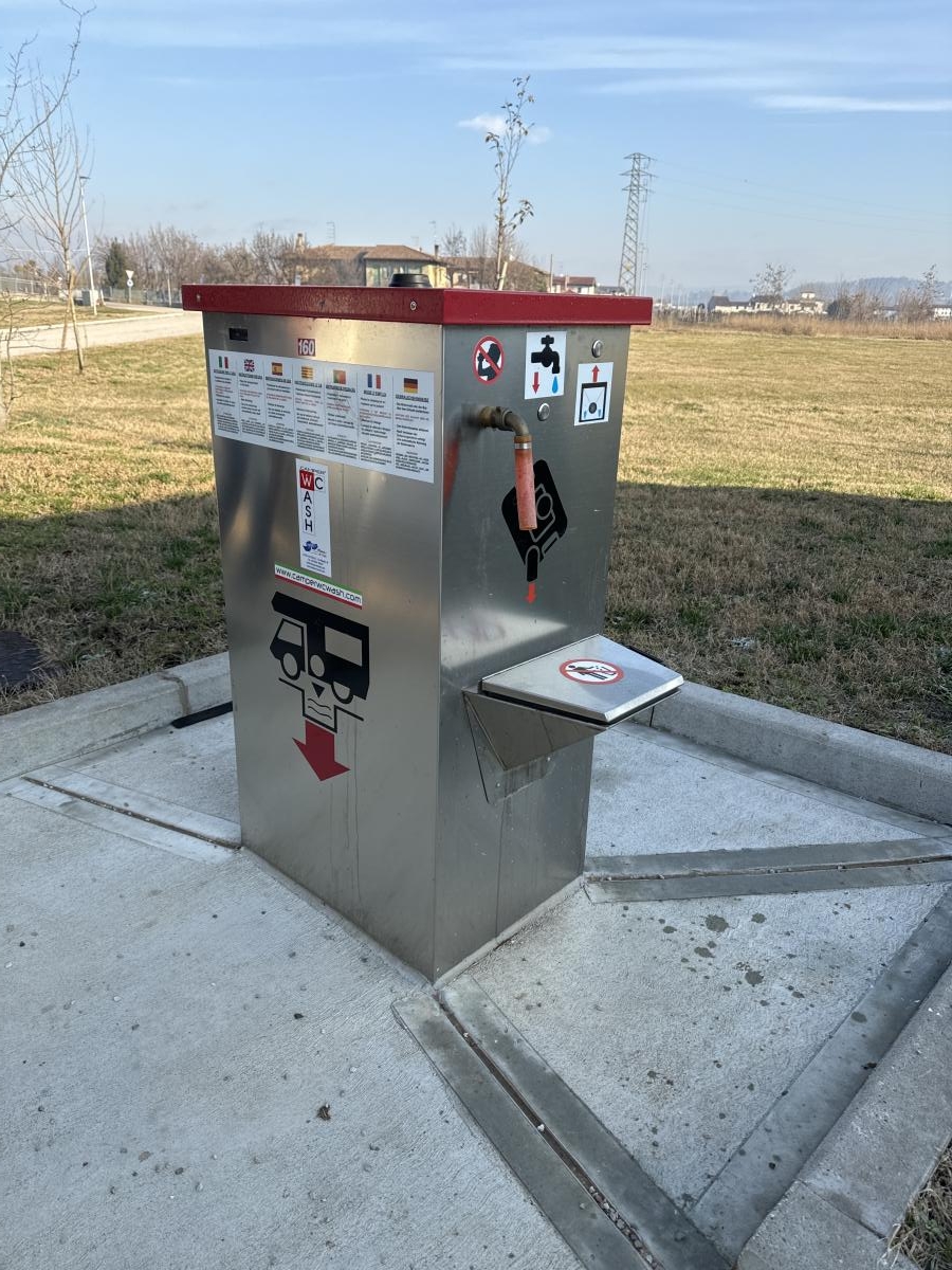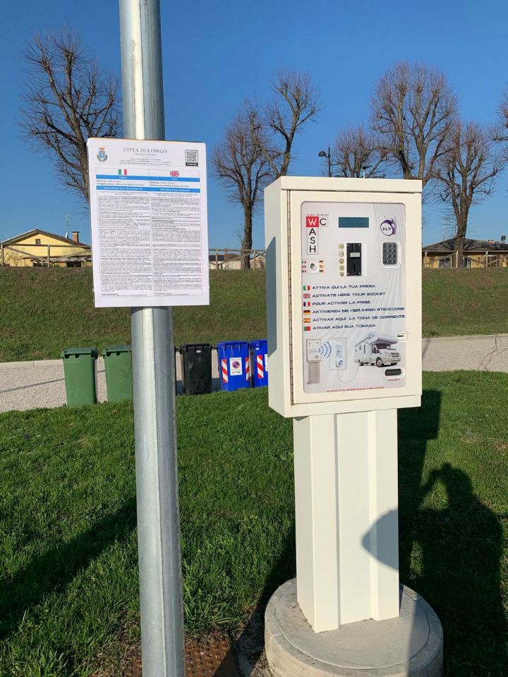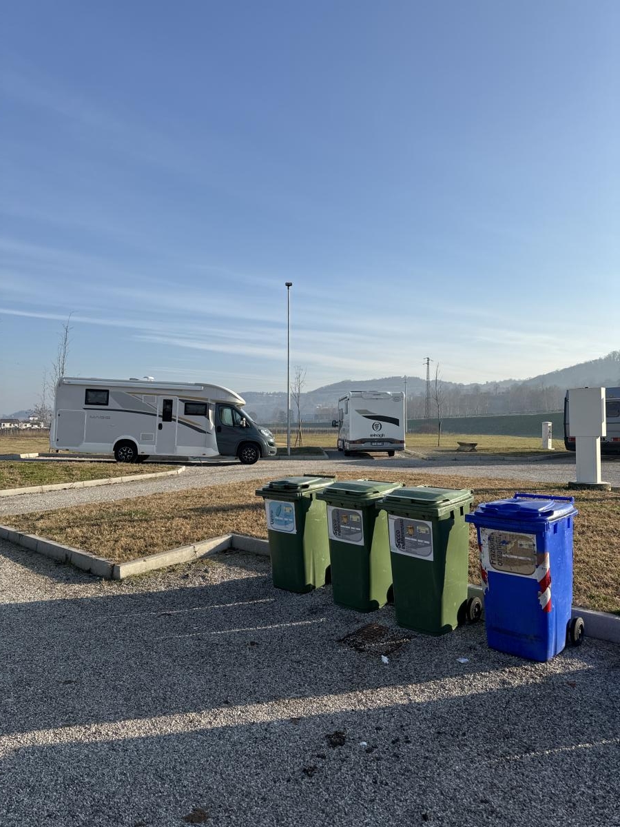 Presente scarico acque grigie e nere, 1 colonnina energia elettrica, 1 colonnina per acqua potabile, cassonetti per rifiuti. Sosta max 48h.