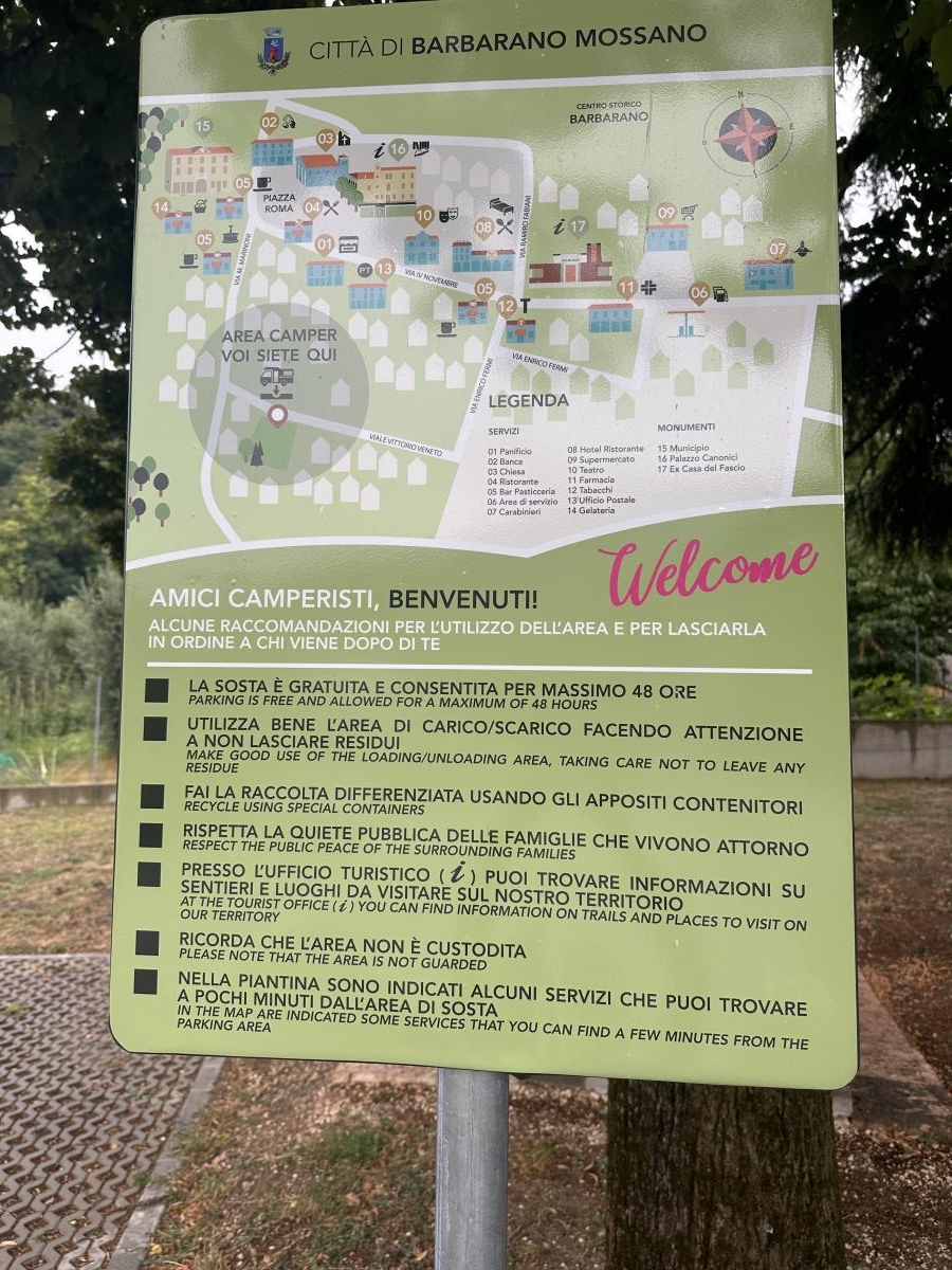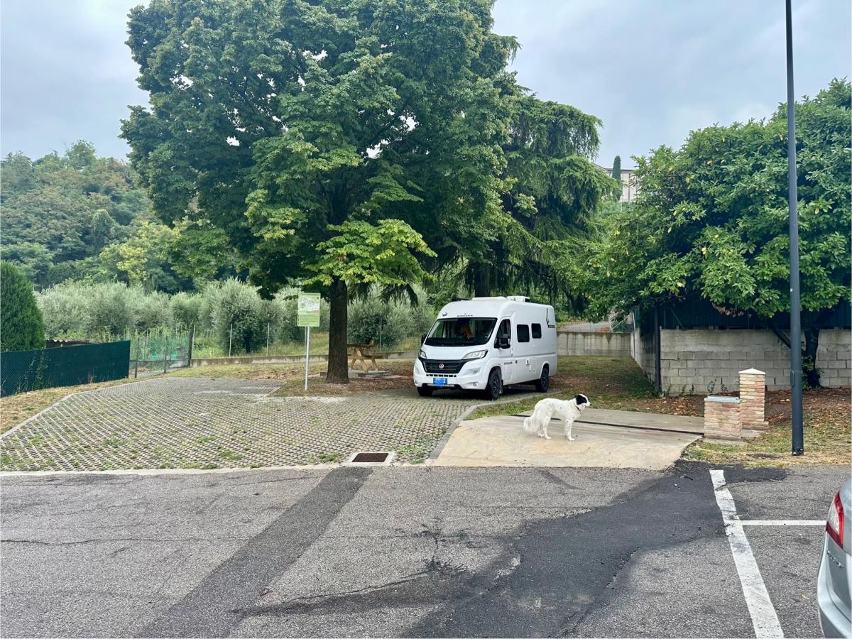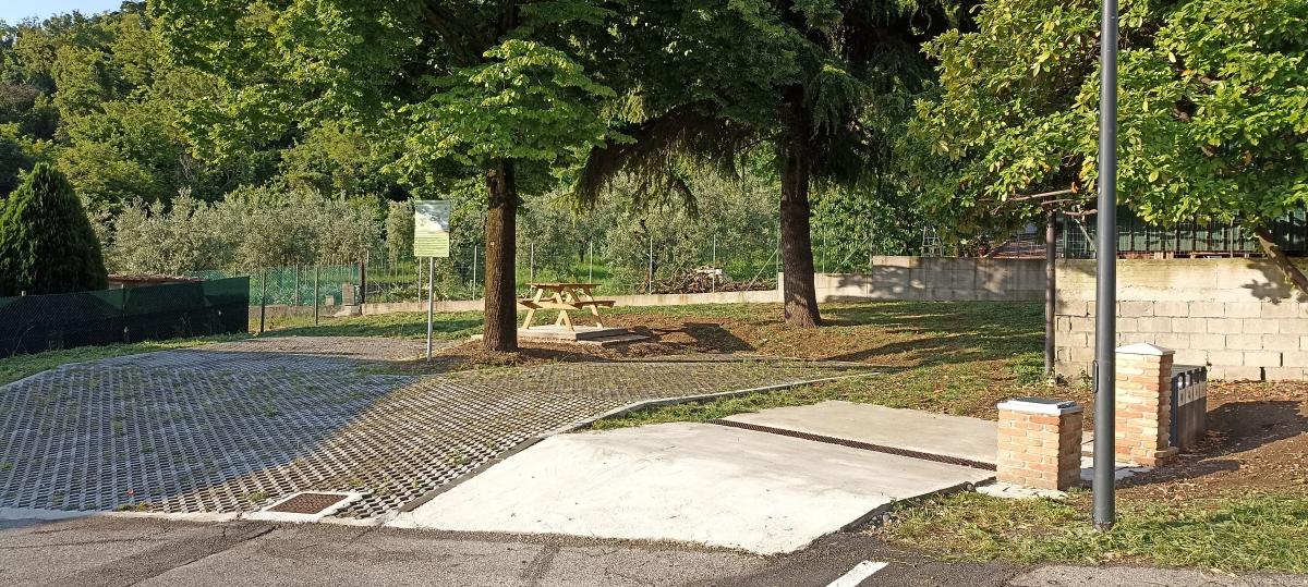 Sui colli Berici, a pochi minuti dal centro, nuovo punto sosta comunale ombreggiato e illuminato con 2 stalli, servizio di carico acqua, scarico cassetta WC e pozzetto, raccolta differenziata dei rifiuti.