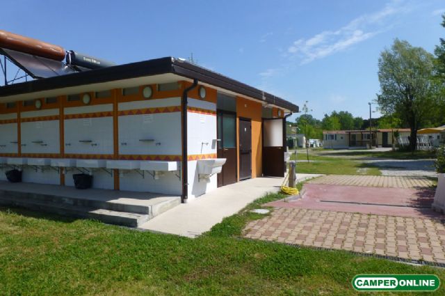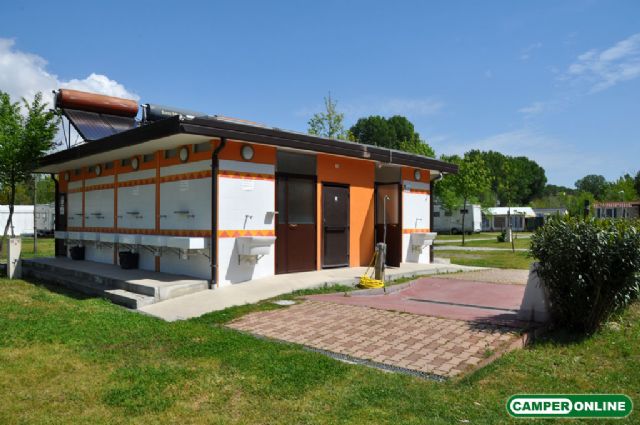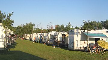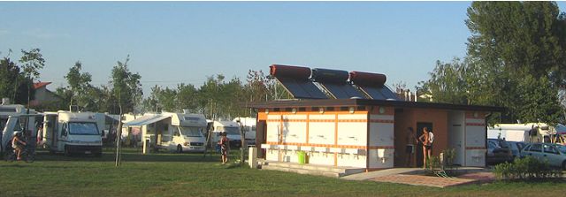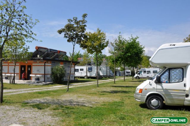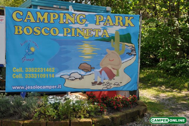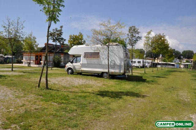 Area attrezzata camper 'Bosco Pineta', a 80 m. dal mare. Ampie piazzole livellate, su prato, modernamente attrezzata con allacciamenti elettrici, blocco servizi, comodo camper service carrabile. *** Area chiusa ***