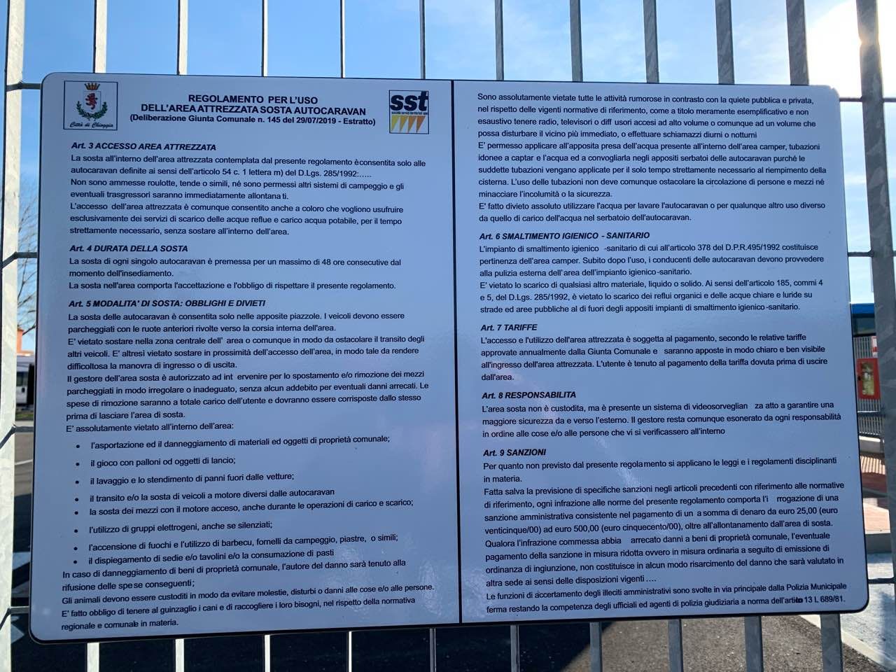 Di fronte la Laguna del Lusenzo, parcheggio comunale per camper, attrezzato, a pagamento. Fermata mezzi pubblici fuori dal parcheggio. Attenzione: sosta max 48h, dopodiché scatta sanzione/maggiorazione.