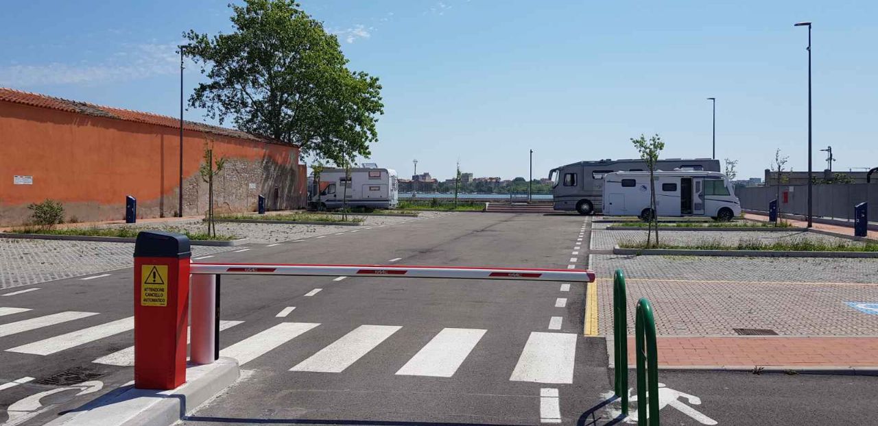 Otima soluzione per parcheggiare vicino al centro storico della città. Per il momento nessun servizio, solo parcheggio, ma è quasi ultimata una parte con stalli predisposti e camper service. Quando sarà aperta sarà collegata alla città dall'itinerario naturalistico della laguna. 6 euro al giorno. Voto 8 ma diventerà 10 quando sarà aperto il nuovo spazio.
