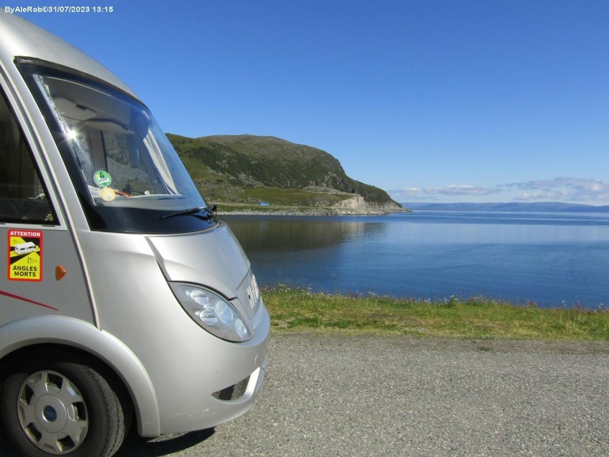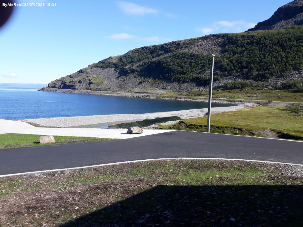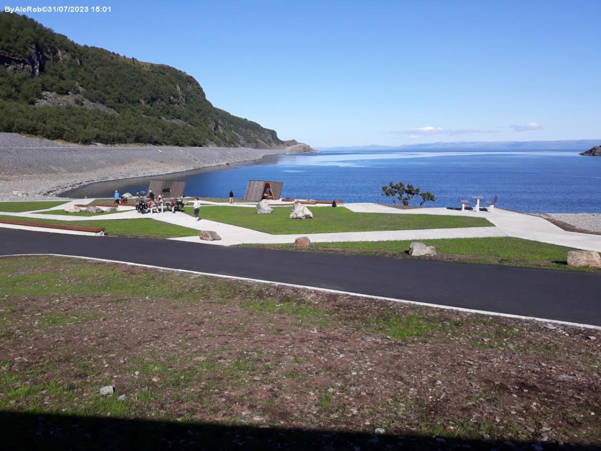 Vicino alla baia, parcheggio con vista sulla spiaggia e il fiordo, piazzole circondate da prato verde.