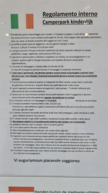 Ottima area di sosta, situata in posizione strategica per raggiungere il sito di Kinderdijk, ma anche per visitare Rotterdam, facilmente raggiungibile con il bus 489 oppure con il waterbus n.20, un po' più caro ma pittoresco. Anche se non si hanno le biciclette al seguito, il paese si raggiunge con una passeggiata di 15 minuti lungo una bella via residenziale lungo il canale, altrimenti si possono noleggiare seguendo le istruzioni nella baracchina vicino alla reception.