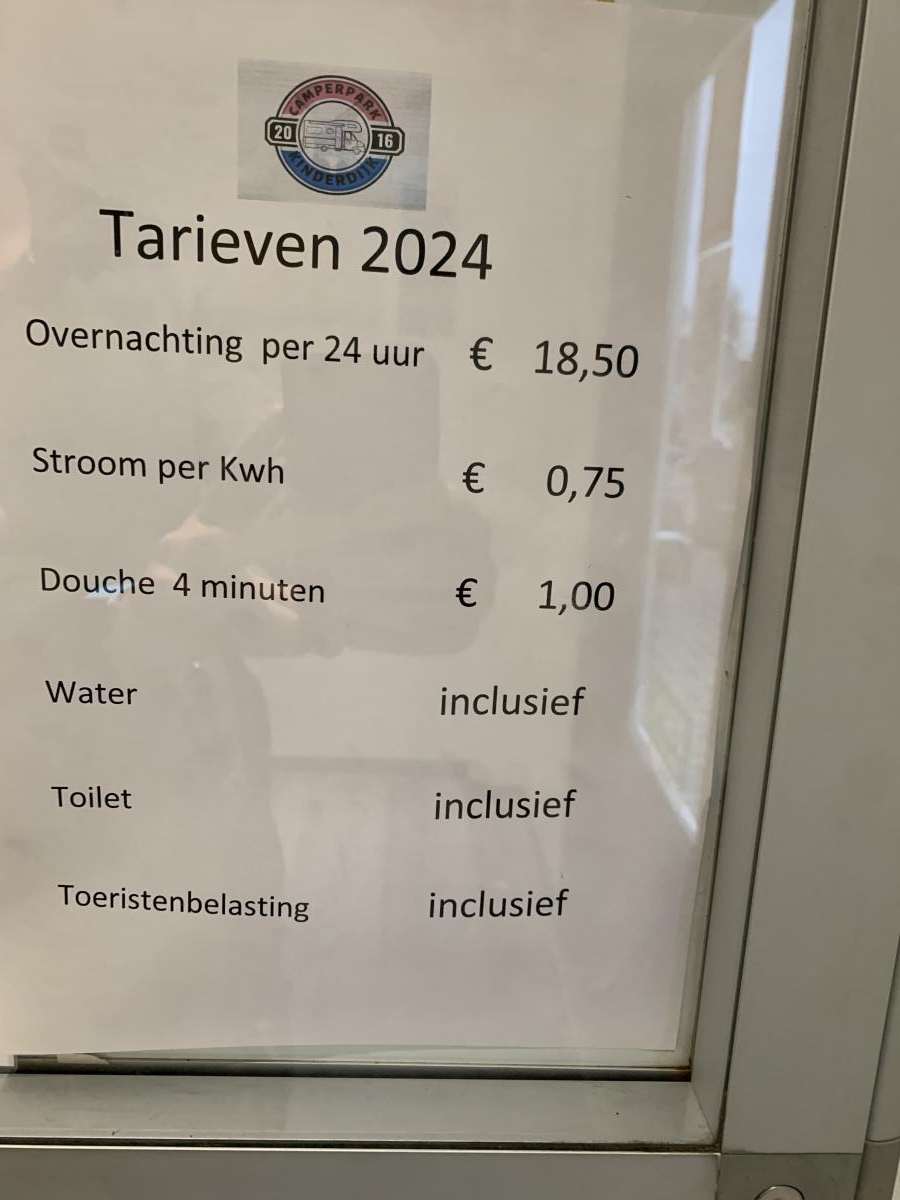 Ci siamo fermati il 25 e 26 giugno. Area tenuta bene, pulita, con carico/scarico, carico acqua e scarico grigie e nere. Corrente a pagamento, €1/3kWh. Doccia a pagamento €1/5 min. Il pagamento si effettua alla cassa automatica, per cui attenzione a rispettare le scadenze, ogni 24 ore scatta. Unico consiglio, portarsi monetine da €1 per la doccia, perché sul posto, al di fuori degli orari di apertura del bar, non c'è possibilità di cambiare. Le foto su COL sono sbagliate, si riferiscono al parcheggio da dove si parte con lo shuttle per Kinderdijk.