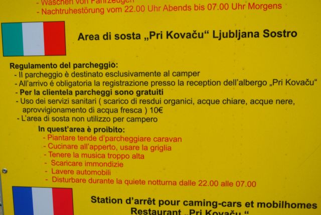 Area sosta un po' spartana fuori Lubiana, per noi scooter muniti facilmente raggiungibile. Se si mangia al ristorante non si paga la sosta. Ottima cucina.