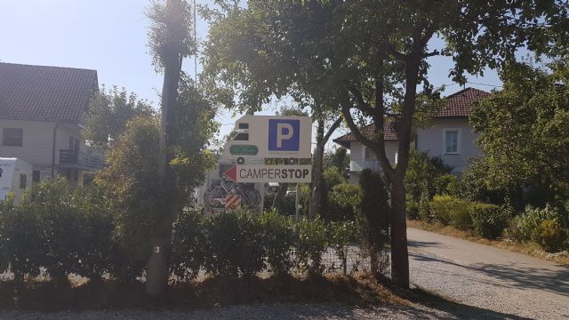 Area sosta ad 8 km dal centro, che si raggiunge col bus n. 13 il cui capolinea davanti all'area, biglietti acquistati in loco. Circa una dozzina di comodi stalli con corrente, carico/scarico. Presenza di simpatico mini zoo. Zona tranquilla, si trova tra casette e giardini. Annessa trattoria che offre cucina locale molto buona a prezzi onesti. Consumando un pasto da loro non abbiamo pagato il parcheggio ma solo 2 euro per la corrente. Titolari gentili, parlano qualcosa d'italiano.
