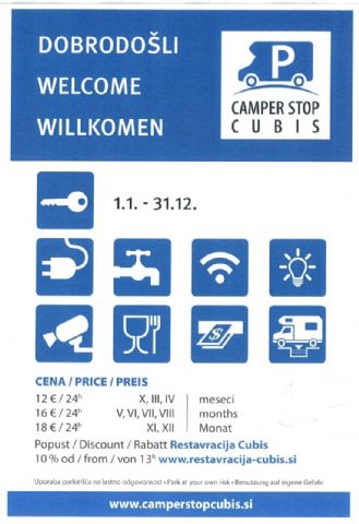 Camper stop Cubis is positioned near highway ((A2 Ljubljana-tunnel Karavanke - exit 9 Kranj-est). It is equipped with 14 pitches (suitable for 12 meter/long motorhome) and it offers water, electricity, free Wi-Fi, restaurant, camper service.