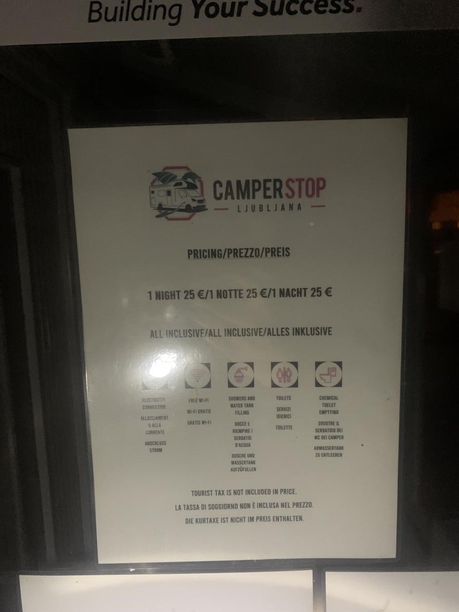 Parcheggio per camper con elettricità, servizi non curati e sporchi, costo 30 euro.In bicicletta si raggiunge il centro della bella Lubiana in circa 20/25 minuti. Oppure servizio taxi su chiamata, efficiente, al prezzo di 12 eur .