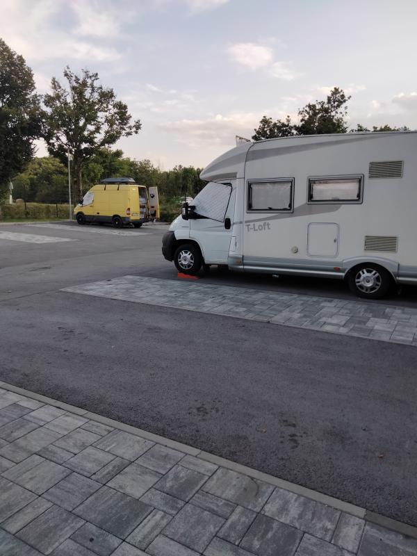 A 600 m del centro area sosta a pagamento all'ingresso con carta di credito, 8 ampi stalli camper su cemento, allaccio elettrico, carico/scarico, lavandini, tavoli e panche per picnic, wifi.