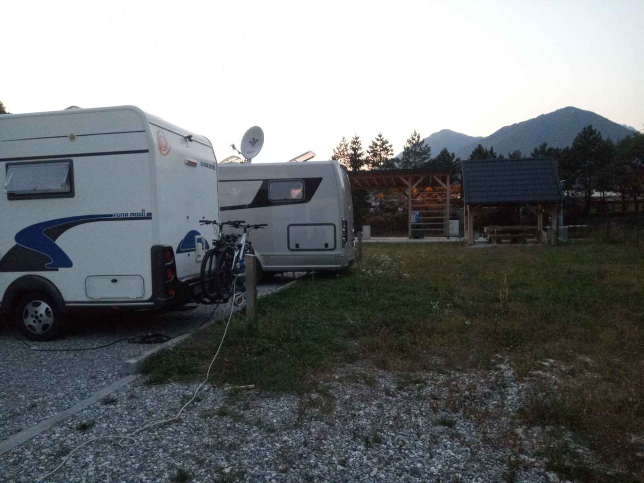 A 2,5 km dal centro di Tolmino, area attrezzata lungo il fiume Isonzo, con 16 posti camper, allacciamento elettrico, carico/scarico.