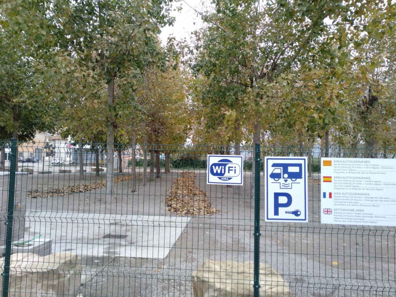 Attigua al distributore carburante Repsol, area recintata, alberata, sulla strada, a pagamento, con 20 posti in piano, allacciamento elettrico, camper service (no nautico) e WiFi.