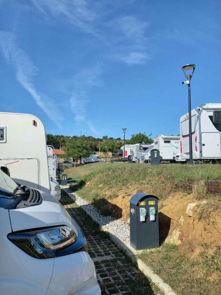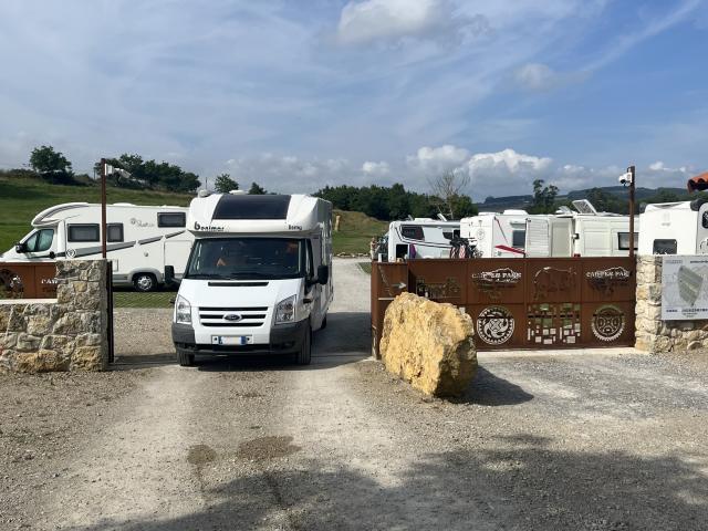 Area sosta camper automatizzata, a pagamento (carta di credito), con 38 stalli su erbablock, allaccio elettrico, carico acqua, scarico WC chimico e grigie. Servizi igienici con docce a pagamento 3 euro/12 minuti.