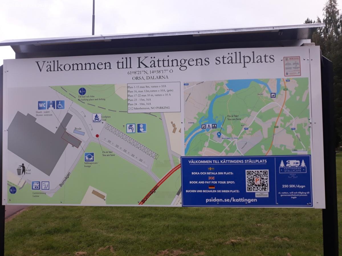 Nella Contea di Dalarna, area camper con 16 spaziosi stalli delimitati e numerati, acqua e allaccio elettrico in ogni piazzola, docce, bagni, lavatrice, cucina comune, lavelli per stoviglie e panni, scarico per cassette e a pozzetto.