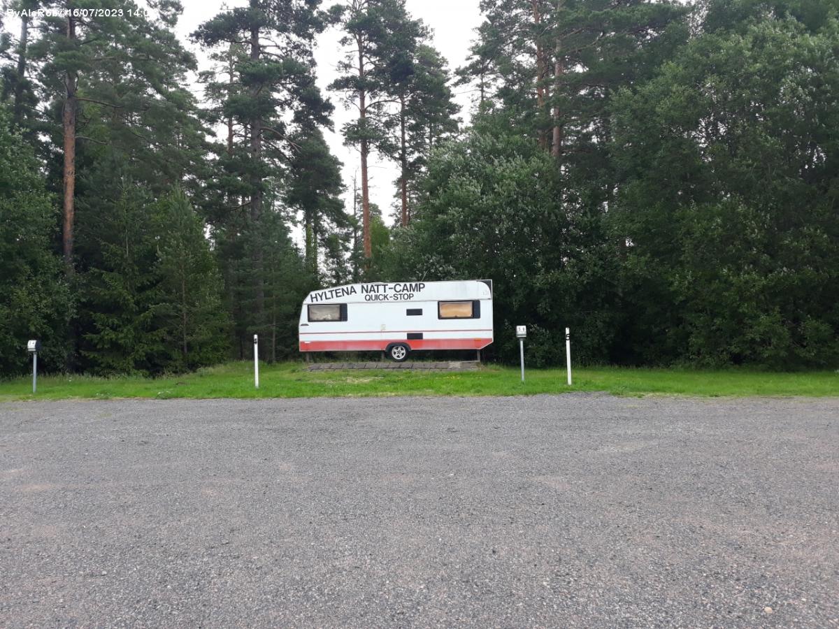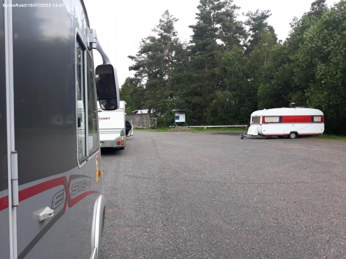 A fianco dell'autoporto, in mezzo agli alberi, in riva al Lovsjon, area sosta sterrata a pagamento.