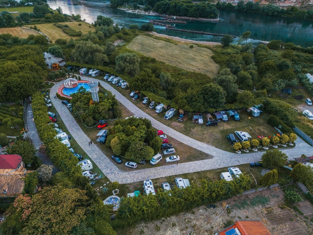 Alla base del castello di Rozafa a poca distanza dal lago e a circa 3 km dal centro, struttura con bungalow e camere albergo a noleggio, e piazzole con allaccio elettrico e rubinetto acqua a potabile.