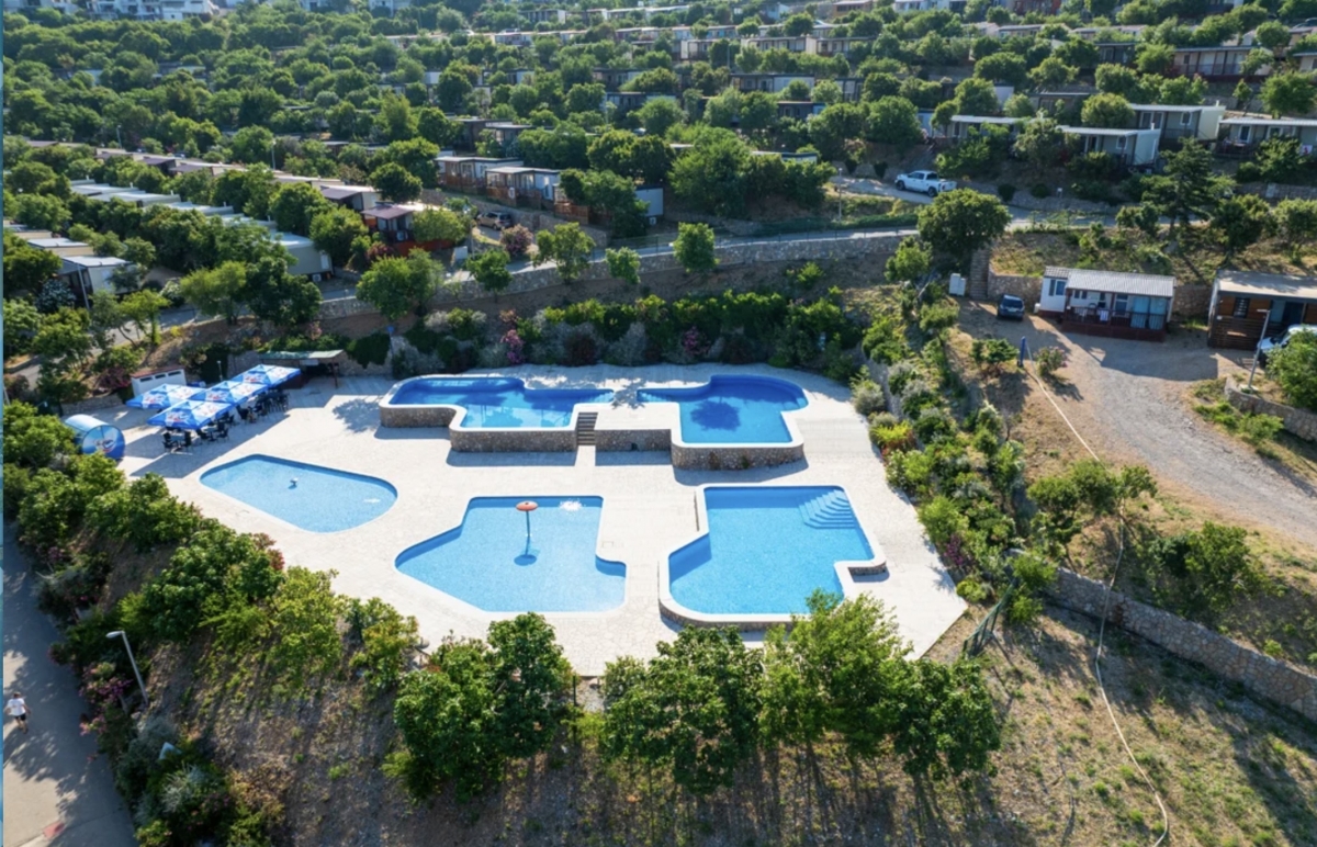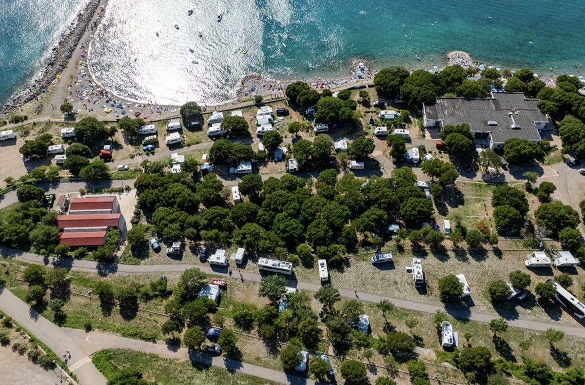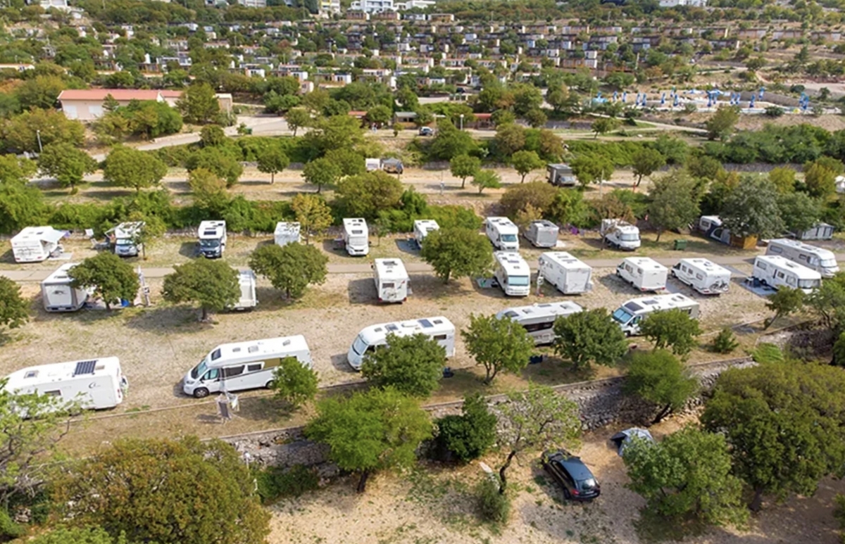 In Dalmazia, a 600 m dal centro, campeggio con case mobili e circa 400 piazzole con allacciamenti elettrici, idrici e fognari.