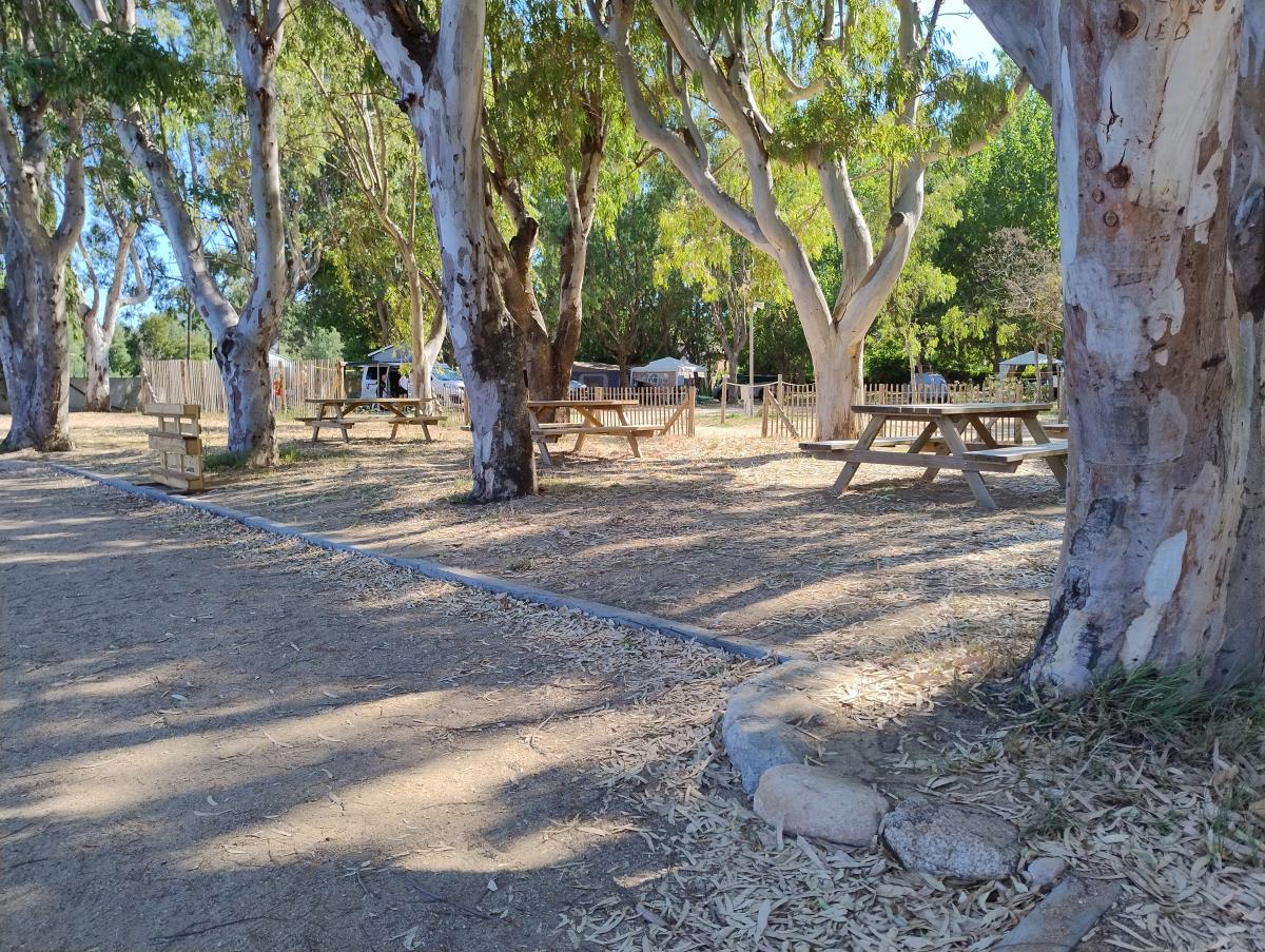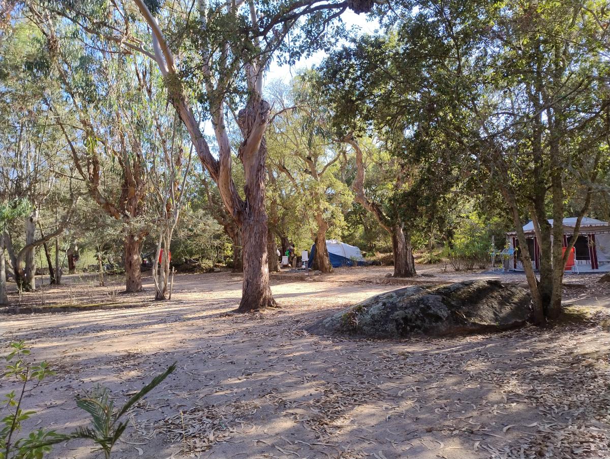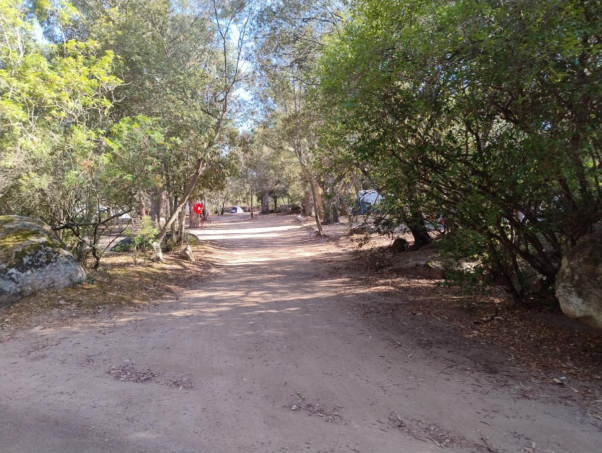 A10 minuti da Porto Vecchio, grande campeggio sul mare con piazzole di diverse dimensioni, alcune fronte mare per camper e caravan, su terra, ombreggiate naturalmente da piante.