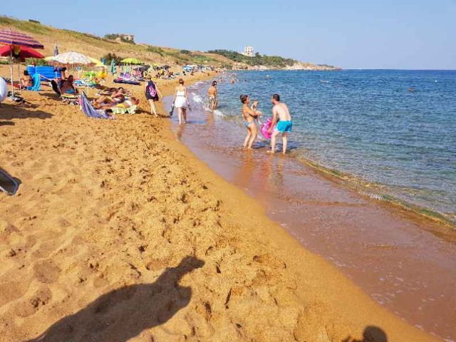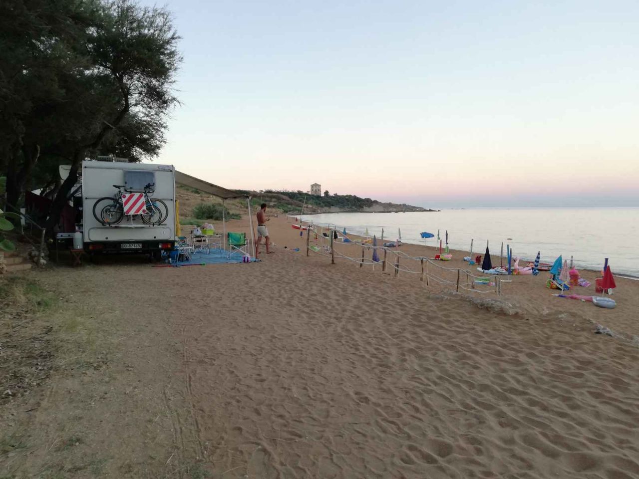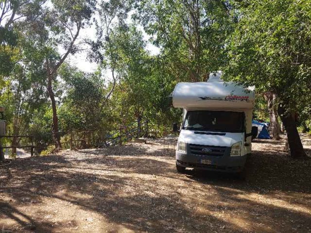 Camping a conduzione famigliare, accesso diretto alla spiaggia di sabbia rossa, con circa un centinaio di piazzole, su prato, ombreggiate da eucalipti, disposte a terrazze con vista mare.