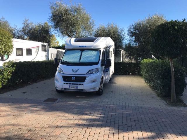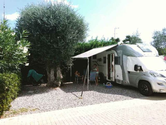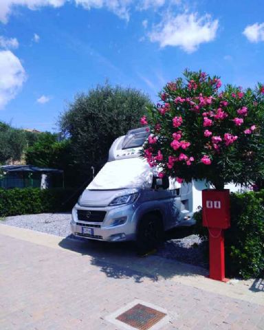 Le piazzole di circa 80 m2 su fondo in ghiaino o autobloccanti, hanno allaccio elettrico da 6A, carico acqua e scarico acque grigie e sono posizionate nella parte bassa del camping (più vicina al centro del paese).