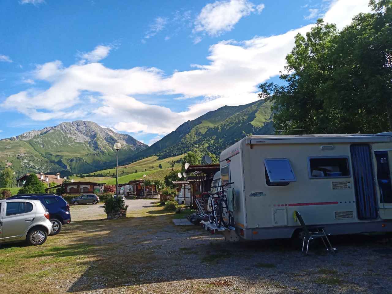 È un campeggio per stanziali, per cui senza vere e proprie aree dedicate "appositamente" per i camper. C'è comunque la possibilità di sostare, allacciarsi alla corrente e fare carico/scarico. Ha due edifici con docce, bagni, lavatrici, ecc. È comunque un bel punto sosta, sito a 1200m, con possibilità di diverse camminate nei monti attorno.