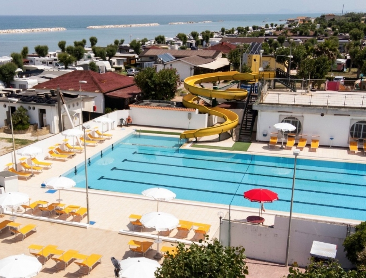 Bagni con acqua calda, docce a gettone, lavanderia con lavatrice, piscina con scivolo, ristorante, bar chiringuito, campi beach-volley, tennis e calcetto, parco giochi, area carico/scarico.