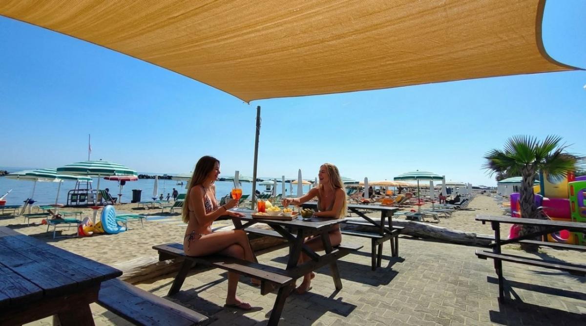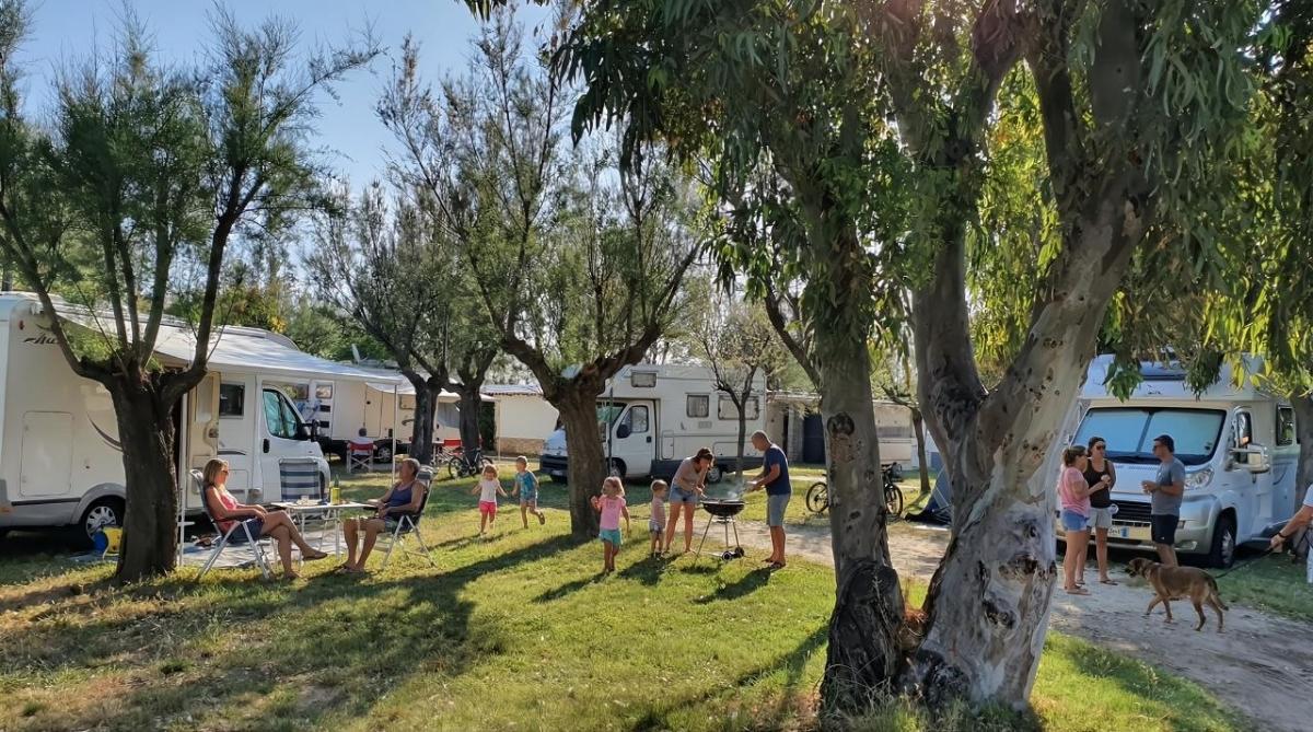 Area sosta camper sul mare con accesso diretto alla spiaggia e ampie piazzole ombreggiate su prato, accessibili a veicoli XL.
