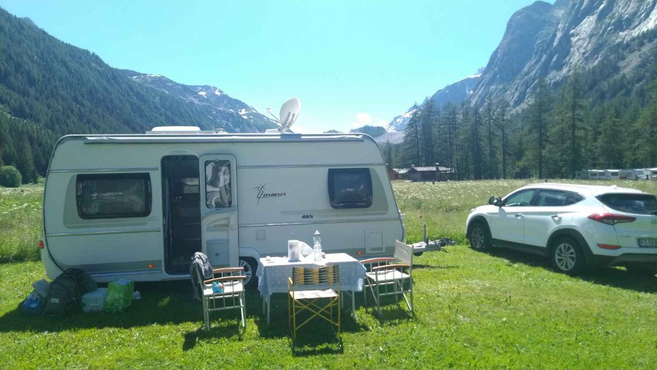Piccolo campeggio con vista panoramica sul Col de la Seigne, con piazzole per camper caravan e tende, glamping e tende a noleggio.