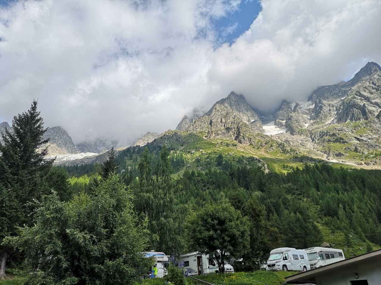 In Val Ferret, a circa 5 km da Entreves, campeggio spartano con vista panoramica sul catena del Monte Bianco Grand Jorasse, dotato di piazzole su erba, ombreggiate.