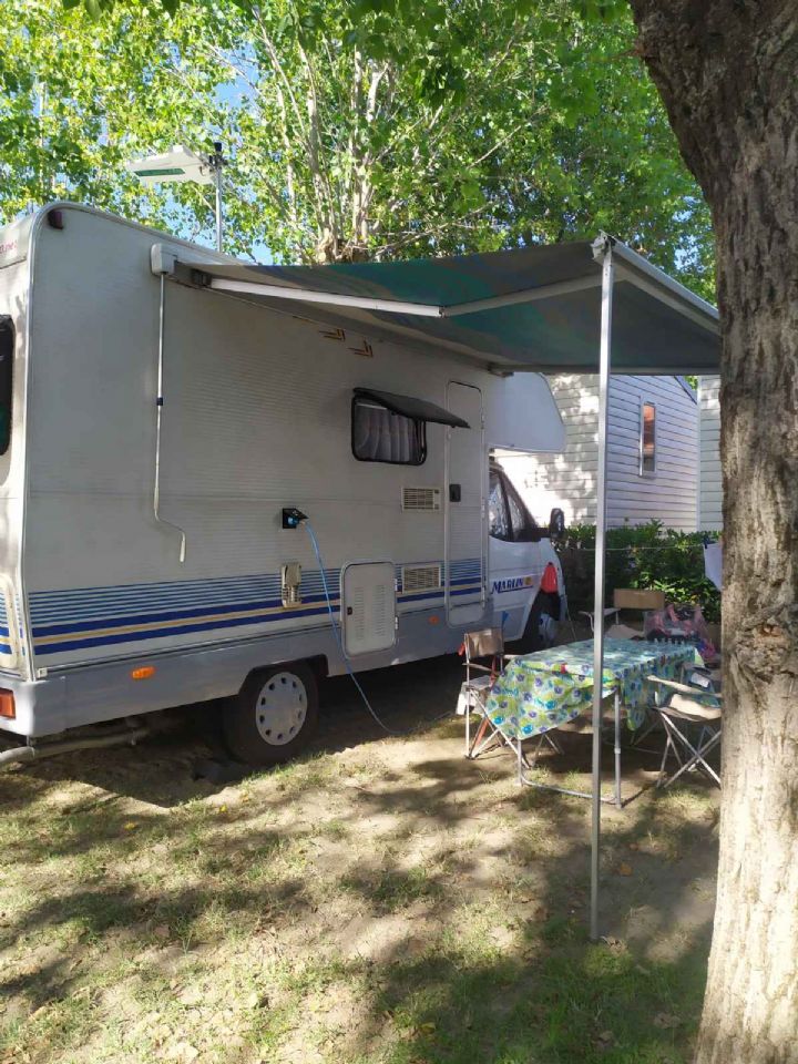 Dispone di un centinaio di piazzole 75 mq fornite di luce, acqua potabile e scarico acque grigie di cui l'80% sono ombreggiate da alberi, 10% da arelle e il 10% al sole.