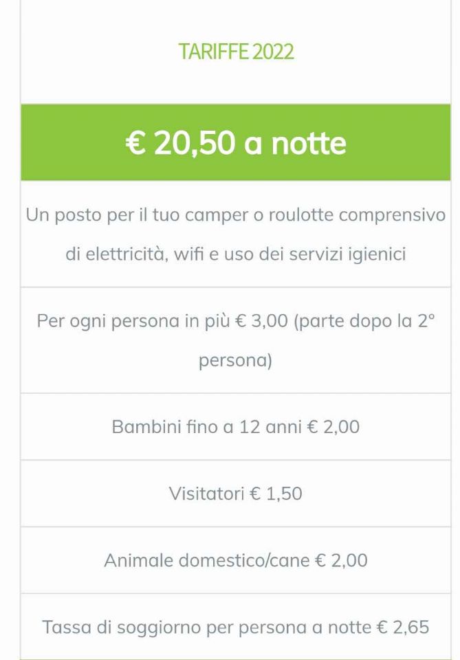 I servizi: elettricità, bagni con docce calde, lavanderia con lavatrice e asciugatrice, lavelli per stoviglie con acqua calda, wifi, carico acqua e scarico in griglia, zona relax coperta.