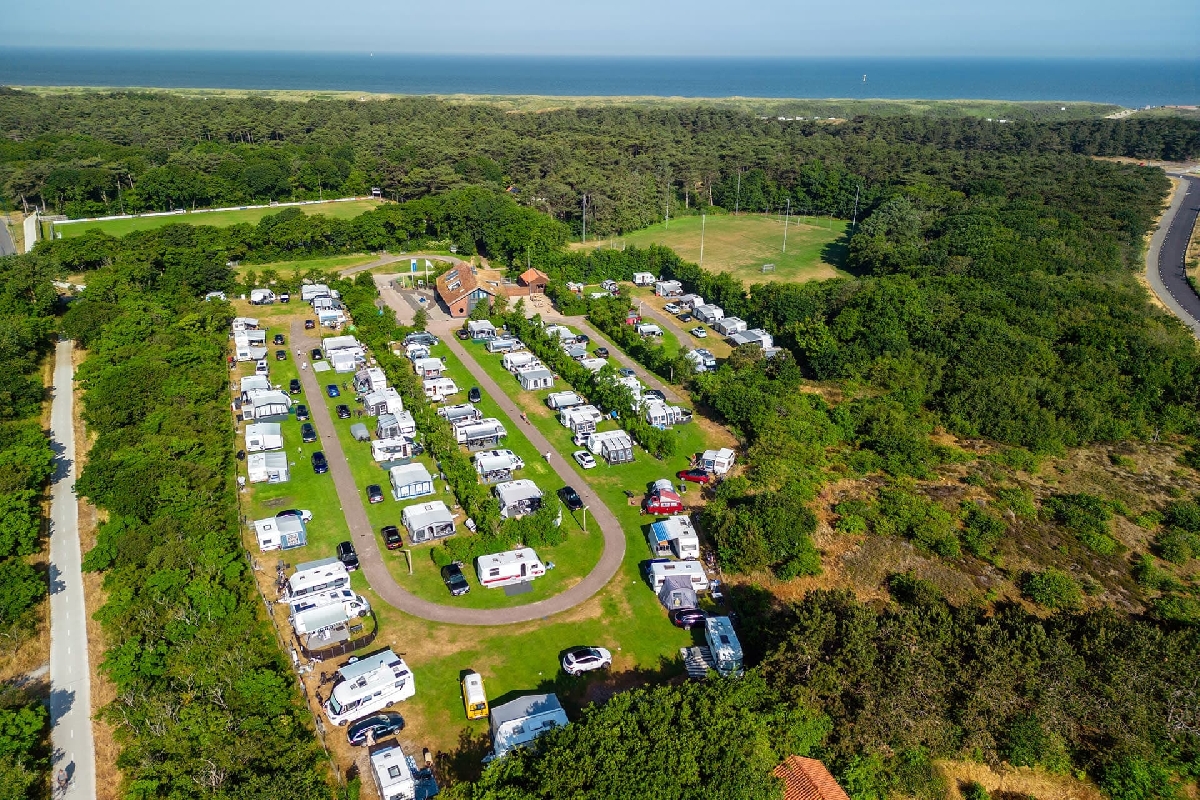 Sull'isola di Texel, a 500 m dal centro e a 1 km dalla spiaggia, campeggio immerso nel verde su erba, parzialmente ombreggiato con 70 piazzole su erba dotate di allaccio elettrico da 10 o 16A.