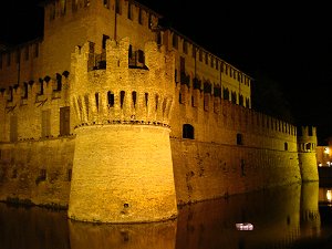castello cinto dal fossato con acqua. Una sapiente illuminazione lo valorizza e sollecita