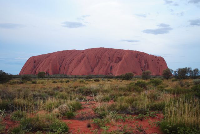 Il mattino successivo lasciamo il camper in un ampio parcheggio e decidiamo di fare il percorso a piedi attorno al monolite, oltre 10 km sotto un sole cocente e quasi senza zone ombrose, ma meritava senz'altro farlo. Da vicino noti ogni avallamento della roccia e le differenze di colorazione dal giallo arancione al rosso vivo, poi grotte, anfratti, e pitture rupestri, mentre alla sera è di un colore ocra rossastro. Queste variazioni pare siano dovute alla composizione del materiale roccioso.