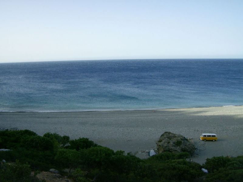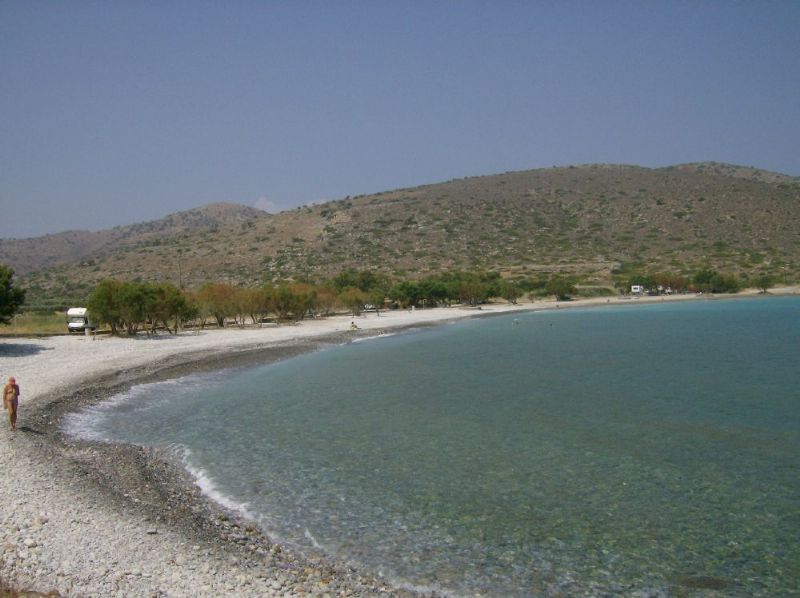Dedichiamo la giornata a bagni, sole e riposo. Il luogo favorisce il relax più totale. Nei momenti di maggior caldo della giornata è possibile andare nelle taverne situate sotto gli alberi di fronte al mare, frequentatissime dai giovani e dalle famiglie accampate sulla spiaggia. Scopriamo che si tratta di una vera e propria comunità di naturisti, soprattutto tedeschi, che trascorrono qui le vacanze in armonia con il luogo. Sulla spiaggia ci sono le docce e un rubinetto che permette di prelevare l’acqua con una tanica, cosa che regolarmente fanno tutti gli abitanti delle tendine! Ci sono anche i wc pubblici.