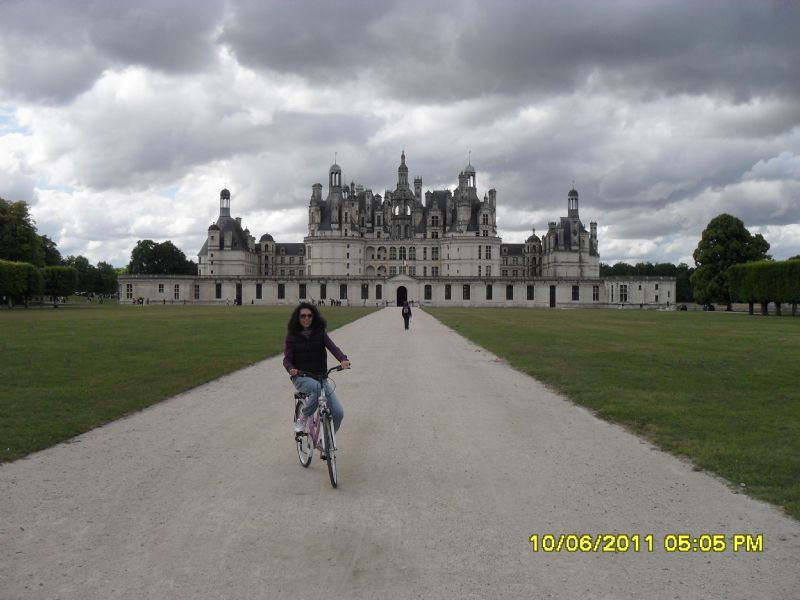 visita al castello spettacolare l'esterno e suoi giardini, non di meno l'interno con le magnifiche stanza arredate di sana pianta, il tempo stringe in volata arriviamo a BLOIS che ci delude, ma approfittiamo della comoda area di sosta a pagamento (5 euro) vicino al castello, per pranzare, riposare e fare cs!! ma io sono troppo euforica per riuscire a stare ferma... dobbiamo andare a CHAMBORD. Arriviamo in pochi minuti e restiamo decisamente bocca aperta.. parcheggiato il mac all'inizio del viale prima dei parcheggi a pagamento del castello, percorriamo con le bici il percorso e il parco interno del castello stesso che è accessibile a tutti, pero' dentro un po' ci delude, è decisamente piu' spoglio e meno curato di CHENONCEAUX. Purtroppo questo sara' il nostro ultimo castello, dobbiamo avvicinarci a casa e scegliamo come sosta notturna BOURGES, arriviamo ancora con la luce (fantastico vedere il sole fino alle 22!) e non ci vogliamo perdere la visita alla blasonatissima cattedrale di ST. ETIENNE che di sera poi verra' illuminata conferendogli ancora piu' fascino. L'area camper di Bourges è molto comoda per la posizione poi è sicura ci sono molti spazi quasi tutti in piano e possibilita' di cs.. gratis!