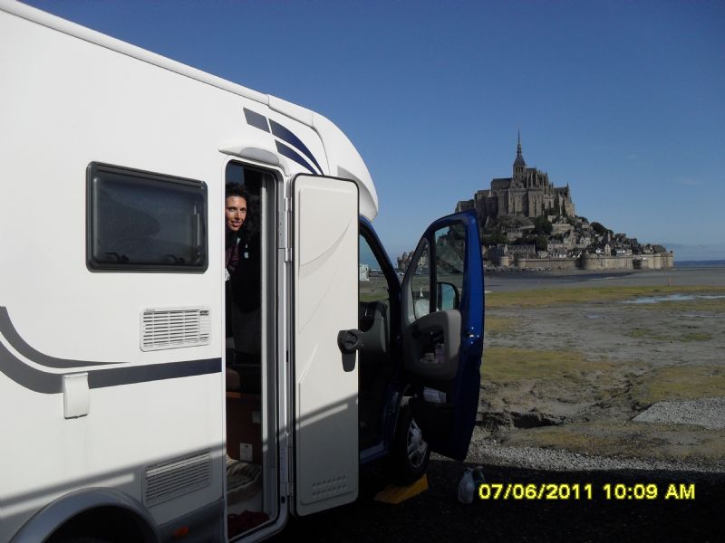 anche oggi il tempo non è bellissimo, ma non stiamo piu' nella pelle perche' la nostra tappa è la tanto agognata MONT SAINT MICHEL, dal bellissimo promontorio di goury, decidiamo di prendercela comoda e fare tutta la costa facendo solo delle brevi tappi a GRANVILLE e TOURVILLE... ed ecco finalmente da lontano apparire l'abbazia ... man mano che ci avviciniamo, sento l'emozione crescere.. e la fortuna vuole che il parcheggio adibito esclusivamente per i camper, sia abbastanza vuoto in modo da trovare una posizione privilegiata con una vista stupenda!! mont saint michel la vediamo cosi': con il cielo nuvoloso del pomeriggio, uno struggente tramonto alle dieci di sera, illuminata di notte - con la nebbiolina umida dell'alba e baciata dal sole di mattina.. e dormire li' sotto NON HA PREZZO! (comunque giusto per informazione il costo del parcheggio per 24 ore e' di 12 euro)
