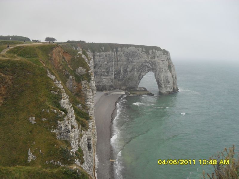 siamo svegliati da un poco simpatico rumore di barchette a motore che iniziano le gite turistiche, la giornata è calda e assolata da permetterci di nuovo di muoverci in bici, visitiamo la cattedrale di notre dame, il parlamento, poi passeggiamo nei bellissimi vicoli con le case a graticcio passando dalla torre dell'orologio, il tempo stringe cosi' ripartiamo ma prima di raggiungere ETRETAT ci fermiamo a CLERES un pittoresco paesino a 28 km da rouen "famoso" per il suo parco botanico e zoologico, che oltre ad essere immerso in un bosco meraviglioso ricco di tante specie di alberi e fiori, ha la particolarita' che quasi tutti gli animali (antilopi, pellicani, pavoni, fenicotteri, canguri.. si' avete letto bene.. canguri) sono liberi!! poi ci sono delle scimmiette in gabbia e un bel castello .. l'entrata è di 6 euro e ne vale la pena!! in piu' in questo paese c'è una bell'area di sosta camper con cs e colonnine elettricita' a gettone. La nostra vera prima tappa in Normandia comincia da ETRETAT dove arriviamo in serata e dove pero' non troviamo un posto ne' nell'area ne' nel campeggio all'entrata del paese, cosi' ci "accomodiamo" in qualche modo sul prato come tanti altri camper, per niente scoraggiati con la bici raggiungiamo immediatamente le falesie e che fortuna: riusciamo ad ammirare uno dei piu' bei tramonti che abbia mai visto! l'unico cosa negativa è il clima, da qui in avanti infatti avremo a che fare con temperature ben distanti dal nostro giugno quasi estivo, tanto vento e qualche temporale, ma eravamo preparati e questo fattore non ha inciso affatto alla buona riuscita del viaggio.
