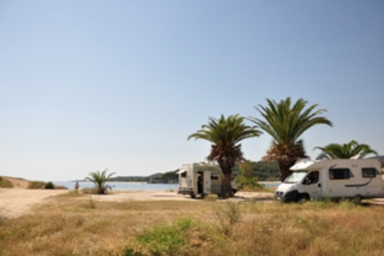 Destinazione penisola di Sitonia; percorriamo un passo di montagna (bellissima giornata ma molto calda) e arriviamo al mare, ci sistemiamo su una spiaggia libera dove, sotto l’unica ombra di due palme sosta già un camper. Il posto è molto ameno ma fa molto caldo.