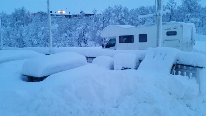 01/01 Risveglio con tanta neve ma nessun problema anche se la strada non è perfettamente pulita...sono le 9 è ancora notte, giornata festiva non c'è nessuno in giro... il camper comunque va una favola con le ottime gomme termiche, siamo molto soddisfatti! Dopo un pò di Km direzione Honningsvag amara sorpresa... strada chiusa, sbarra abbassata da poco meno di un'ora, infatti alla partenza da Skaidi ancora non era stato segnalato nel sito della situazione strade che consultavamo di continuo.
