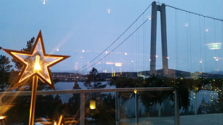 03/01 Piccolo giro per Umea e prossima meta l'Hoga Kusten, una parte della costa svedese sul Golfo di Botnia con isole, laghi e un Parco Nazionale. Naturalmente paesaggio completamente innevato e acque ghiacciate. Sosta allo Hoga Kusten Hotel (buonissimo ristorante, vista stupefacente sul ponte, e un parco giochi per bambini divertentissimo).