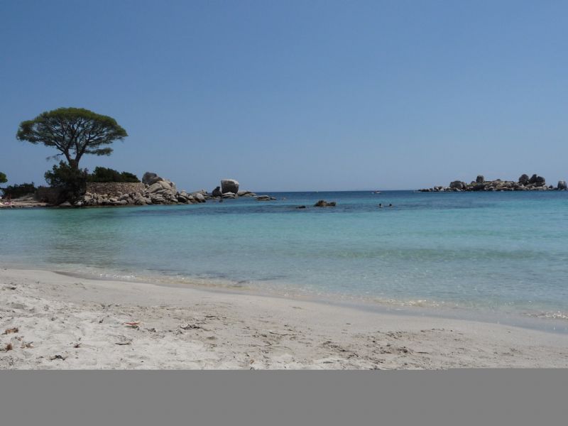 Decidiamo di passare la giornata alla Palombaggia perché abbiamo letto che percorrendo la spiaggia verso sud è possibile raggiungere le bellissime spiagge di Tamaricciu e Asciaiu. Così ci mettiamo in marcia e dopo 40 minuti di cammino, superando un promontorio roccioso, raggiungiamo la spiaggia Tamaricciu, riconoscibile per la presenza del pino sul lembo di terra che si protrae verso il mare. Decidiamo di fermarci qui, la lunga camminata vale la meta raggiunta e l’acqua è stupenda con miriadi di pesci da inseguire con la maschera e le pinne.