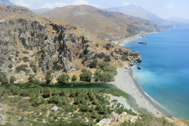 La mattina successiva partiamo per Festo passando per il bel lago montano di acqua dolce di Kournas. Qui gonfiamo la nostra canoa e attraversiamo il lago per vedere i famosi granchi rossi giganti che popolano, con le tartarughe, il lago. I pesciolini nel frattempo massaggiano i nostri piedi lasciati appositamente in ammollo. Fatto un bel bagno nell’acqua dolce ripartiamo per fermarci a fare un secondo bagno alla famosissima spiaggia di palme di Preveli. Prima però lungo la strada non possiamo mancare di visitare l’antichissimo monastero di Piso Moni Preveli dove, durante la seconda guerra mondiale, i monaci aiutarono moltissimi alleati a fuggire in Egitto pagando a volte con la vita il loro eroismo. Usciti ci troviamo all’improvviso di fronte ad un altro miracolo della natura: una spiaggia bianchissima che chiude la foce di un fiume circondato da centinaia di palme da dattero. Un altro spettacolo di quest’isola: veramente imperdibile! Scesi a piedi dal parcheggio custodito, dove è possibile eventualmente dormire anche la notte, risaliamo a piedi il fiume, che è di fatto l’oasi naturale, per scoprire ogni angolo di questo paradiso. I turisti purtroppo sono moltissimi (ma non sempre è possibile essere da soli......). Ripartiamo poi il pomeriggio verso Festo. Lungo la strada, essendo ormai sera, decidiamo di fermarci per la notte al paesetto di pescatori di Timbaki dove dormiamo molto bene sul parcheggio del porticciolo (illuminato con fontanella).