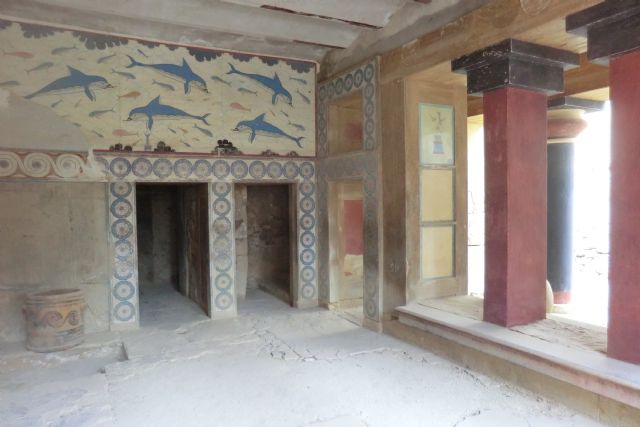 La mattina ripartiamo sempre verso ovest per andare a visitare il bellissimo sito minoico di Malia (anche questo da non perdere....!). Ripartiamo dopo poche ore per Iraklio per andare a parcheggiare (e poi dormire la sera….) nel grandissimo ed affollatissimo parcheggio illuminato del sito minoico di Knosso. Il sito però si rivela (almeno per noi.....) una delusione. Essendo stato scoperto (e poi ricostruito in modo a volte discutibile e fantasioso con pilastri e travi in cemento armato........) dal cosiddetto “archeologo” Arthur Evans ha perso di qualsiasi fascino. Fatto sta però che il sito è stracolmo di turisti! Evidentemente non sono del nostro parere..... Finita la visita e scaricata la vespa dal camper (ma si possono utilizzare anche gli autobus con fermata di fronte al parcheggio) scendiamo fino ad Iraklio per visitare la città e specialmente il suo famoso museo. Tornati a Knosso veniamo invitati a trascorrere una bella serata in compagnia dagli abitanti del posto. Trascorriamo con loro una piacevole serata gustando a casa loro dell’ottimo rakì. Poi a nanna per dormire benissimo tutta la notte.
